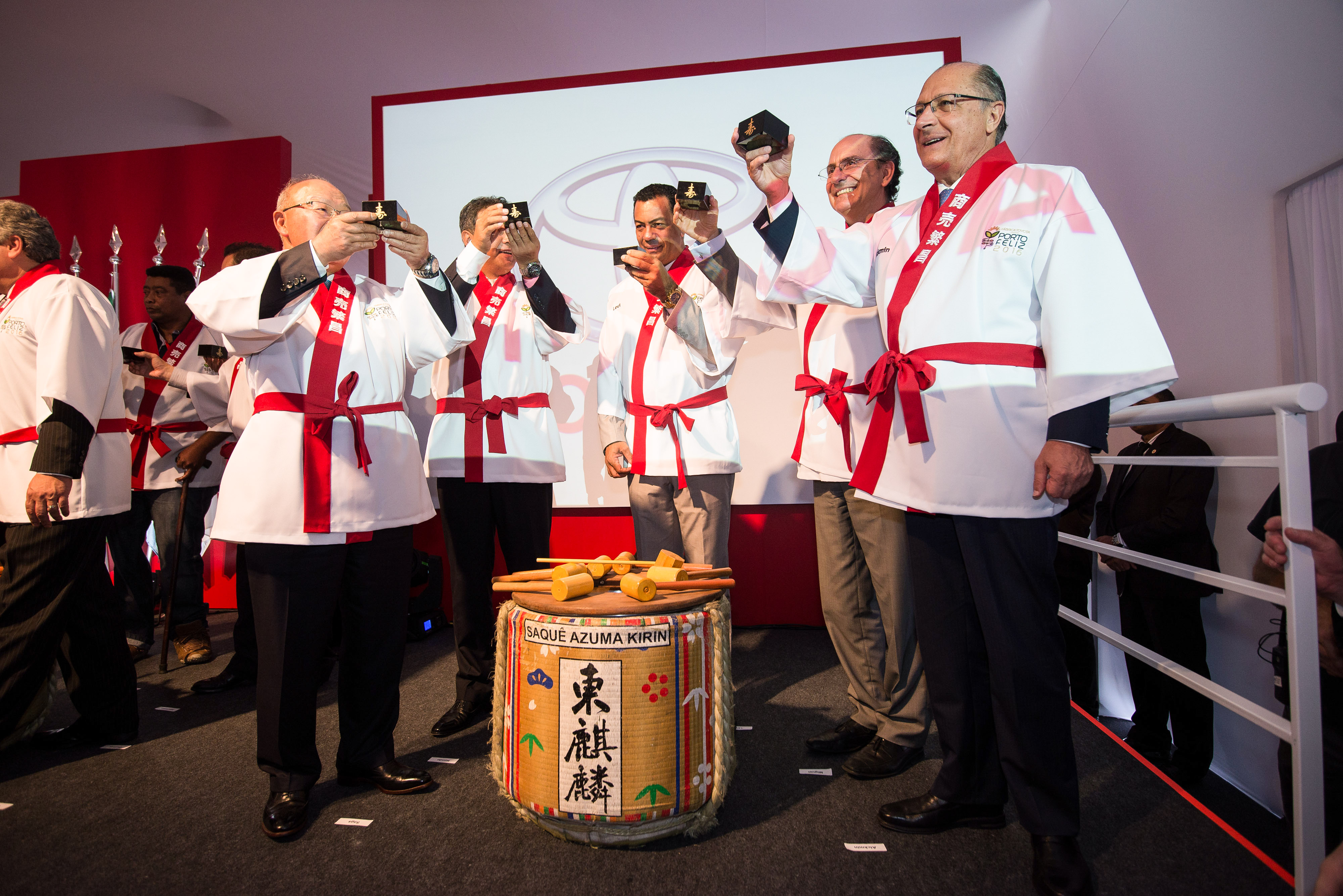 Steve St. Angelo(Senior Managing Officer-Toyota Corporation, CEO-Latin America & Caribbean Region)氏や大勢の来賓がエンジン工場の門出を祝った。鏡開きでは登壇者全員がはっぴを着用、中前サンパウロ総領事が梅田大使のメッセージを読み上げ、一昨年8月に来伯し安倍総理が述べた日本の中南米外交における、「三つの指導理念」、3つのジュントス「発展、主導、インスピレーションを共にしよう」と言う意味の「progredir juntos、liderar juntos、inspirar juntos」 を披露、乾杯の音頭を執った。