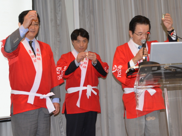 Takahiro Nakamae, cônsul-geral do Japão em São Paulo, Aiichiro Matsunaga, presidente da Câmara e Shinji Tsuchiya, vice-presidente da Câmara, no ritual de "kagami biraki", tradicional quebra de barril de saquê.