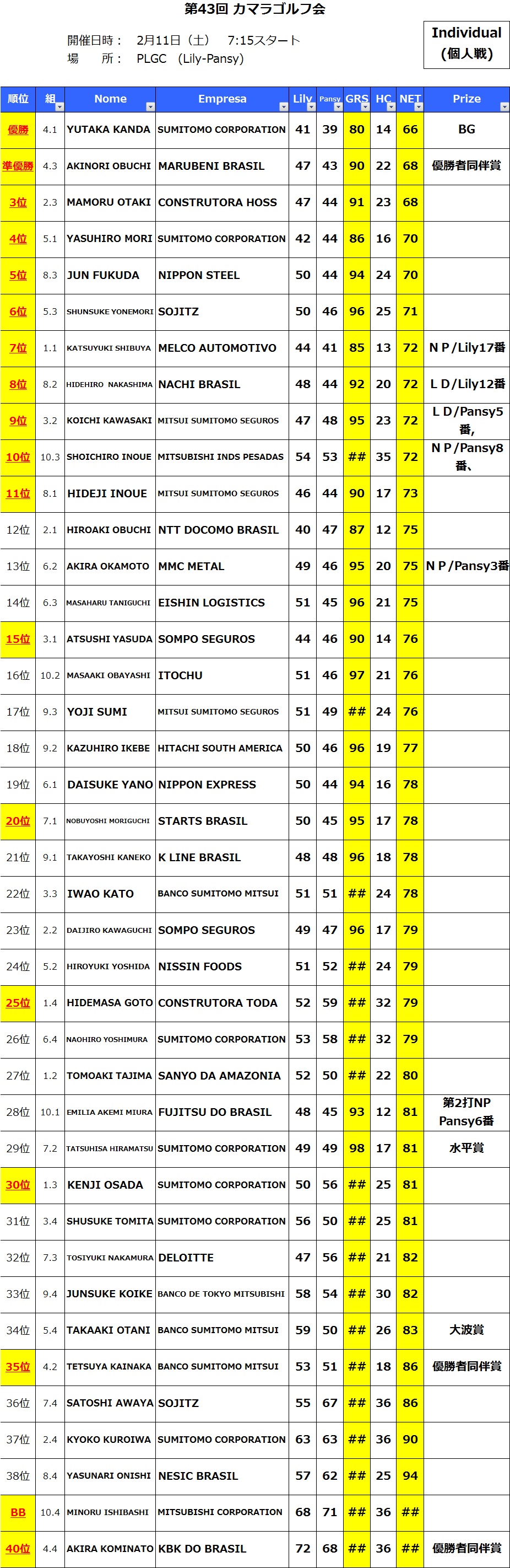 優勝はKANDA様(Sumitomo Corporation)がLily 41・Pansy 39、HC 14、NET 66のスコアで獲得、2位にはOBUCHI様(Marubeni Brasil)、3位にはOTAKI様(Construtora Hoss)が入りました。