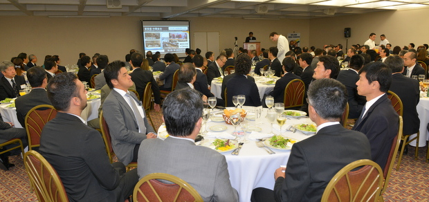 講師歓迎の辞では運輸サービス部会の細谷浩司部会長は、業界最大手JSL社の2代目社長のフェルナンド社長がわざわざ参加して講演して頂くが、60年前にサンパウロ市近郊の蔬菜栽培の中心地のモジ市から野菜を大消費地のリオ市に運ぶ事業からスタート、その後の飛躍的な事業拡大の話について聞けるのは参加者にとって貴重な経験になると説明、フェルナンド社長は、ビデオで同社の事業拡大について説明、南米4か国、ブラジル国内に20州に220支店網を擁して、14配送センターを網羅、2000年以降15年間で売り上げは30倍以上に拡大、レンタカー、都市バス、貨物一般、鉱山向け輸送機械のレンタル、道路輸送、港湾関連輸送事業、、ロジスティック事業全般、鉄道輸送、港湾浚渫工事事業、船舶輸送、輸送監視システム、医療関連輸送事業、食品・飲料並びに鉄鋼・金属、公共事業、都市間交通、化学、農業など16セクターで事業を展開、また社会的貢献として環境保全事業、節水事業、燃料消費削減事業などにも全社挙げて積極的に参加していると説明、村田会頭から記念プレートが贈呈された。