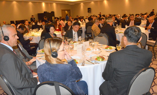 3月の懇親昼食会は2015年3月13日正午から午後2時までインターコンチネンタルホテルに150人が参加して開催、進行役は平田藤義事務局長が務め、初めに特別ゲストとして、藤村 修 元野田内閣官房長官/あしなが育英会副会長、佐野 浩明 在サンパウロ日本国首席領事、柳瀬和夫 あしなが育英会国際課長、室澤 智史/ JICAブラジル事務所、木多 喜八郎/ブラジル日本文化福祉協会 会長、本橋 幹久/県連 会長、後藤 隆/ブラジル日本商工会議所第8代会頭、貞方 賢彦/ブラジル日本商工会議所第13代会頭、田中 信/ブラジル日本商工会議所第15代会頭、二宮 正人/ CIATE理事長、CAMILA STUCK /JCI ブラジル青年会議所がそれぞれ紹介された。