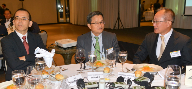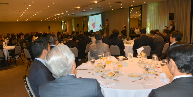 4月の懇親昼食会は、2015年4月10日正午から午後2時までチボリホテルに150人が参加して開催、司会は平田藤義事務局長が務め、初めに特別ゲストとして上田 善久パラグアイ共和国駐箚特命全権大使、福嶌 教輝 在サンパウロ日本国総領事、室澤 智史JICAブラジル事務所 所長、安井 豊JBIC国際協力銀行 代表、菊地 義治サンパウロ日伯援護協会 会長、レナート・イシカワ サンタ・クルース病院 理事長、カミーラ・スツックSTUCK JCI ブラジル青年会議所 会頭が紹介された。