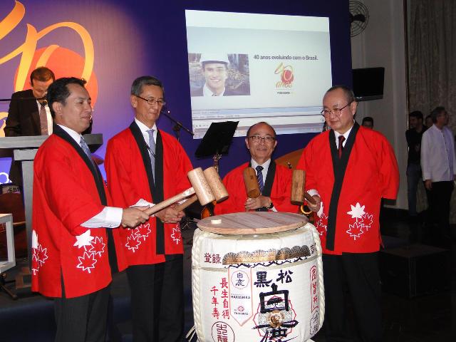 福嶌総領事、海堀会長、吉田社長、平田事務局長が鏡開きを行った。最後の閉会挨拶は吉田社長が参加者へ丁寧にお礼、またブラジルYokogawa 設立当時の伊藤武 元社長も「40年前に自分の妻を含めた6人体制でスタートした。チリ、アルゼンチン、ペルー、コロンビアにも業容を拡大、今現在70倍の陣容、420人に成長し非常に満足している。」と、熱い思いを込め3度繰り返した「有難う」の言葉が会場を沸かした。