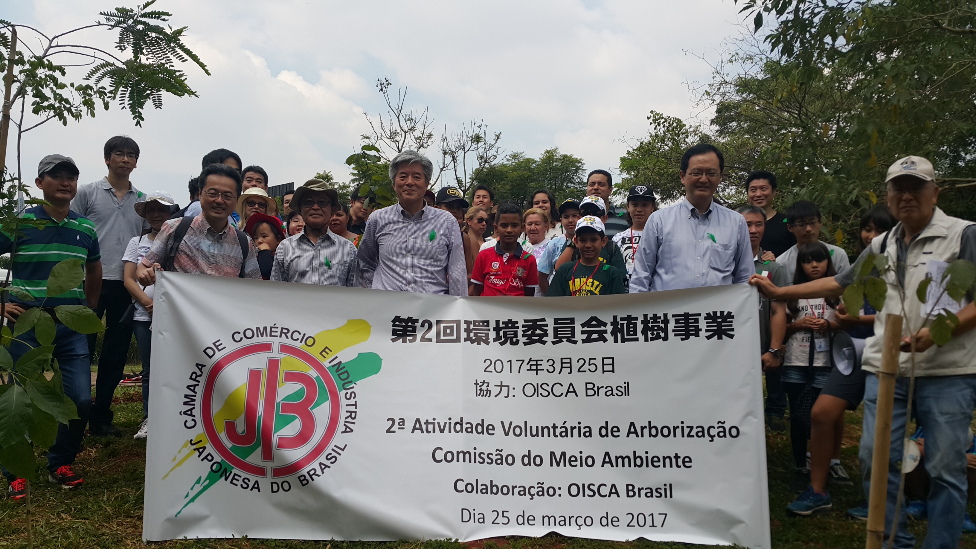 多くの子供達も参加したこの植樹会は,オイスカ・ブラジル総局の高木様,ブラジル・ニッポン移住者協会の小山様をはじめとした沢山の方々の協力を得て行なわれた。待合場所の駐車場からトレンジニョ(遊覧電車)で植樹地に向かいイペー・ブランコ,フィゲイラ・グランデやファウソ・バラチモンなどブラジル特有の樹木200本の苗を約1時間かけて植樹。最後には,中前隆博在サンパウロ日本国総領事(会議所名誉顧問),樹神環境委員長(三菱重工南米総代表)による記念植樹が行なわれ,参加者全員で記念写真を撮影した。