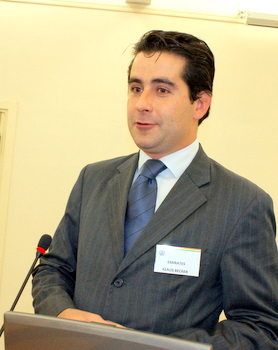青年会議所のファービオ・カワウチ氏は企業経営MBAコースの案内ではパウリスタ法科大学との提携、企業の金融経済MBA,新企業会計、新企業経営、戦略マーケティング、JCI会員への割引などを説明、エミレーツ航空のクラウス・ベッカー取締役はドバイ経由によるサンパウロ-東京便の快適なビジネスクラス、ファーストクラスをビデオで紹介、アイセック東京大学委員会の藤原芽偉氏はリーダーシップをとれる国際人の養成のために、企業の日本の学生の受け入れを依頼、3社の企業が研修生の受け入れを決めたことに対してお礼を述べた。藤原さんは3月25日までサンパウロに滞在、コンタクト先は mei_fujiwara19@yahoo.co.jp