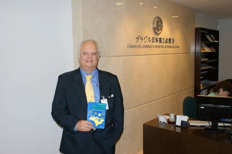 商工会議所に贈呈した自著“Guideline on Brazul´s Foreign Investment Law” を掲げる