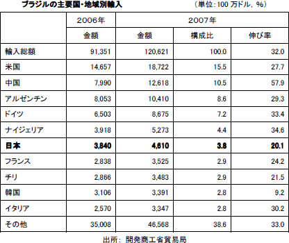 ブラジルからの主要輸出品目は鉄鉱石、大豆や鶏肉など思いがちだが、航空機47億ドル、乗用車も47億ドル、自動車部品32億ドル等に代表される工業製品が半分以上を占め粗糖、セルロースや鉄鋼半製品などを加えると約7割となる。 一次産品の割合は3割に過ぎない。一方、輸入は原材料/中間財が約半分を占め、資本財が2割、以下燃料/潤滑油、消費財の順となっている。 07年は06年同様、輸入の伸びが輸出の伸びを顕著に上回った結果、貿易黒字が11年振りに前年を下回った。一次産品の輸出は成長しているが、レアル高の影響で輸出全体のペースが低下傾向にある。