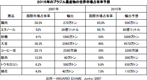 ブラジルの国土面積は世界第5位、851.2万平方キロメートルで日本の約23倍だ。世界人口が60億人を超え食糧危機が懸念される中、温暖な気候、豊富な水資源、肥沃な土地に恵まれ、ますます食料基地としての地位を築きつつある。現在の耕地面積は6200万ヘクタール、さらに牧草地として使用中の約2億2000万ヘクタールが別に存在し、短期転用可能な未耕地面積は9000万ヘクタールに及び、日本の耕地面積500万ヘクタールの18倍である。 穀物類だけの生産に限れば90/91年度5千8百万トン(面積3790万ヘクタール)から06/07年度に1億3千百万トン(4620万ヘクタール)に増えた。この間の生産性は186%向上した。 (出所:CONAB 農務省アグリビジネス国際関係局08年度出版冊子) 新たに必要とする農産物の生産に莫大な栽培面積を有し、世界が警戒するアマゾン熱帯雨林の伐採で開発する必要性は全く無い。下表の様な農産物生産では世界の供給国として益々重要性が高まっている。