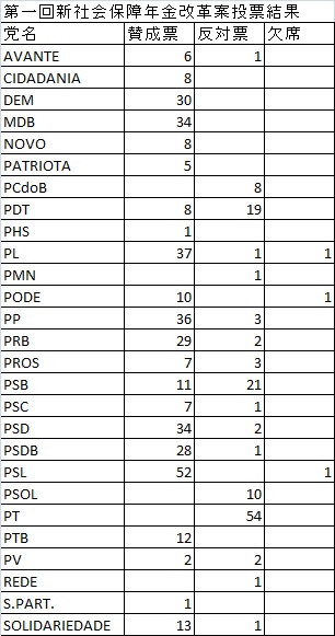最も新社会保障改革法案に反対していたブラジル社会党(PSB)では11人の下院議員が賛成票を投じている。民主労働党(PDT)では8人の下院議員が賛成票を投じたが、サンパウロ州選出のTabata Amaral議員は賛成票を投じると表明したために、裏切り者呼ばわりされて党除名処分に晒されていたにも拘らず、賛成票を投じている。