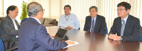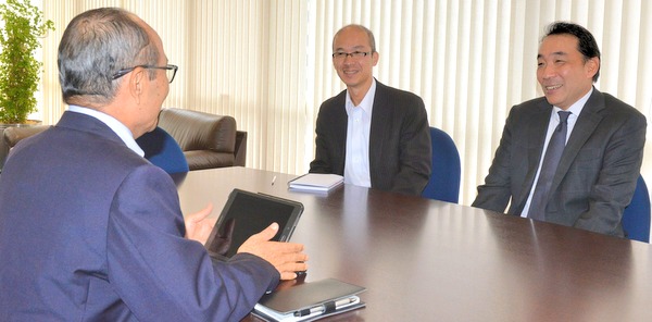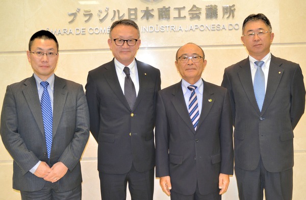 ブラジル三菱重工の植田真五社長、新たに着任した山田佳宏副社長、MHI Sul-Americana Distribudora de Motores Ltdaの馬場新社長が2018年4月17日に商工会議所を訪問、応対した平田藤義事務局長と日下野成次総務担当と部会並びに委員会活動について意見交換を行った。
