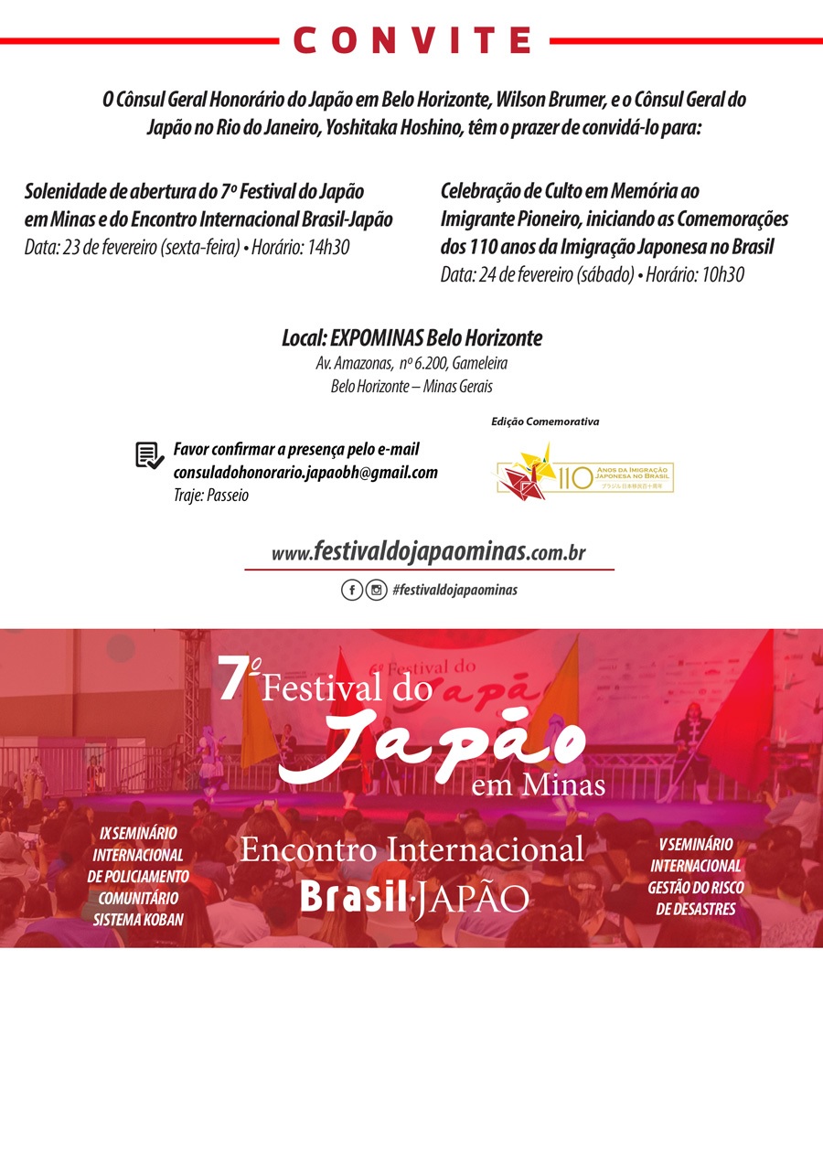 在ベロ・オリゾンテ日本国名誉総領事館及び在リオデジャネイロ日本国総領事館より「第7回ミナス日本祭り 7º. Festival do Japão em Minas」のご案内を頂きましたのでお知らせ申し上げます。