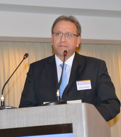 最後にトカンチンス州のマルセロ・ミランダ州知事の講演を前に松永愛一郎会頭が講師歓迎の辞を述べ、ミランダ州知事はトカンチンス州農業ビジネス特別ゾーン「ZEN(Zona Especial de Negócios)-Tocantins Agro」プロジェクトについて、 トカンチンス州農業ビジネス戦略として穀物、飼料、冷凍肉・魚類の加工品輸出を視野に入れたビジネス特区ーアグロヴァレトカンチンス構想では、州内1100万ヘクタールの放牧地の集約的活用として、大豆やトウモロコシ生産拡大で食肉・淡水魚養殖、加工食品生産して国内外に出荷、搾油企業や飼料企業、畜産企業、水産企業の育成及び関連する機材・装置生産企業、一次産業の育成、パルマス市近郊にエタノール生産並びに再生可能エネルギー、可能食肉処理企業、食品加工企業以外にも肥料並びに農薬、種子などの農業生産資材企業、技術支援やロディスティック支援及び研究機関、職業訓練機関の設立などについて説明した。